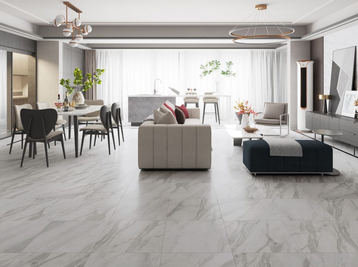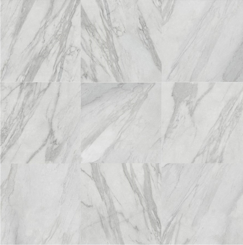 This Carrara marble effect tile has an antique design to emulate the flooring of some of the classic European buildings in which the natural stone is used. This porcelain tile is an excellent recreation of this marble and has a soft grey background.