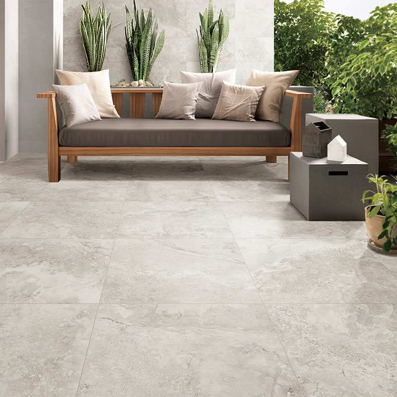 Pietra Cinder and Pietra Salt are 2 cm thick stone effect porcelain tiles designed to be used as an exterior paver. The thickness allows for them to be installed in raised applications on deck jack systems, dry laid on compacted material similar to concrete pavers, or glued to a solid substrate.